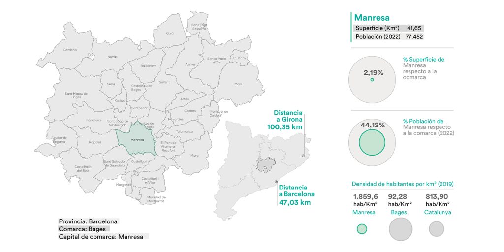 Manresa, la capital de la comarca del Bages (80.200 habitantes el 2025), tiene una ubicación estratégica en la Catalunya central. Conectada por importantes infraestructuras viarias y ferroviarias y cercana a la confluencia de los ríos Cardener y Llobregat, la ciudad ha sido un núcleo relevante en diferentes momentos de la historia de Catalunya. Cuenta con un rico patrimonio histórico (la Seu de Manresa, la Séquia, un canal medieval que aún hoy lleva el agua a la ciudad, o el camino Ignaciano, patrimonio religioso y cultural) y con un tejido productivo e industrial en continua transformación (polígonos industriales de Bufalvent o Pont Nou, con actividad industrial innovadora vinculada a universidades y centros de investigación).