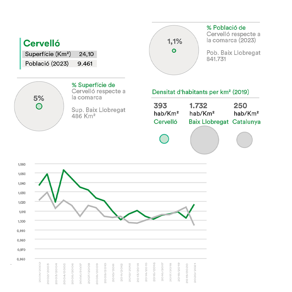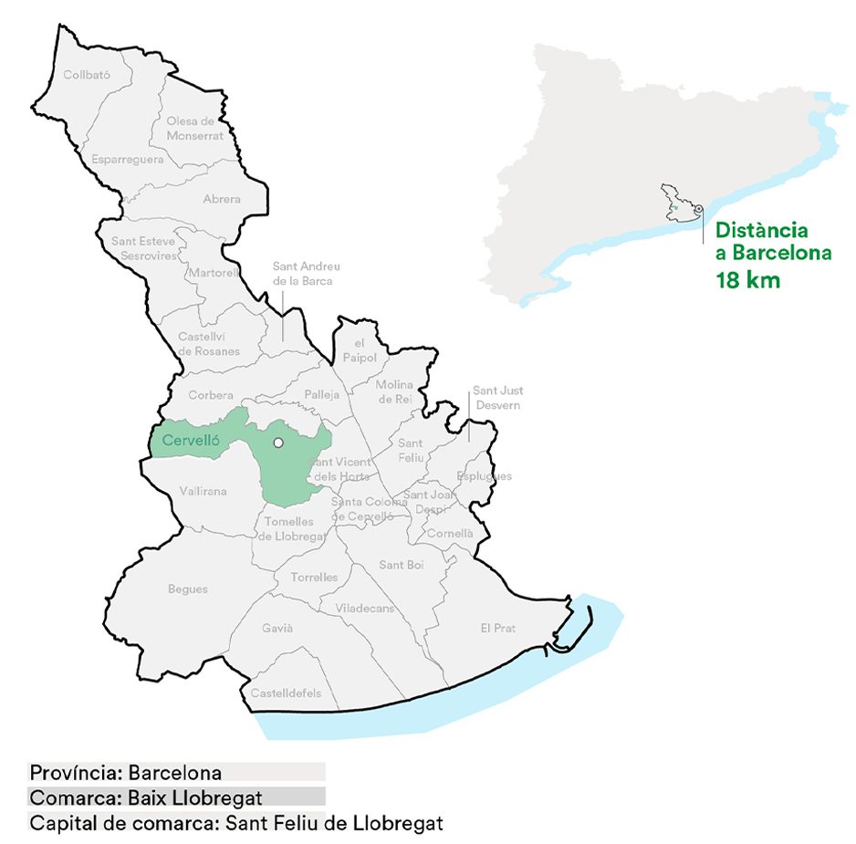 Cervelló es un municipio de cerca de 10.000 habitantes del Área Metropolitana de Barcelona. Está en la comarca del Baix Llobregat, entre la margen derecha del Llobregat y el macizo de las montañas del Ordal. Separado del primero por un corredor de infraestructura metropolitano (las autovías A2 y B-23, la línea de ferrocarriles de la Generalitat o el trazado del Ave Madrid-Barcelona) y el parque agrario, su desarrollo está ligado a las dinámicas del Área Metropolitana de Barcelona. Su núcleo histórico, situado en la antigua Carretera Reial de Barcelona a Valencia (posteriormente la N-340), se encuentra rodeado por 14 urbanizaciones dispersas y de baja densidad (19,22 hab/ha de media en todo el municipio) que conforman el término municipal, poblado por bosques en un 78% de su territorio. El municipio, que creció durante parte del siglo XX a partir de segundas residencias vinculadas a la naturaleza, ha visto como su población no ha dejado de crecer durante el siglo XXI, consolidando población que escapa de los precios de la vivienda de Barcelona.