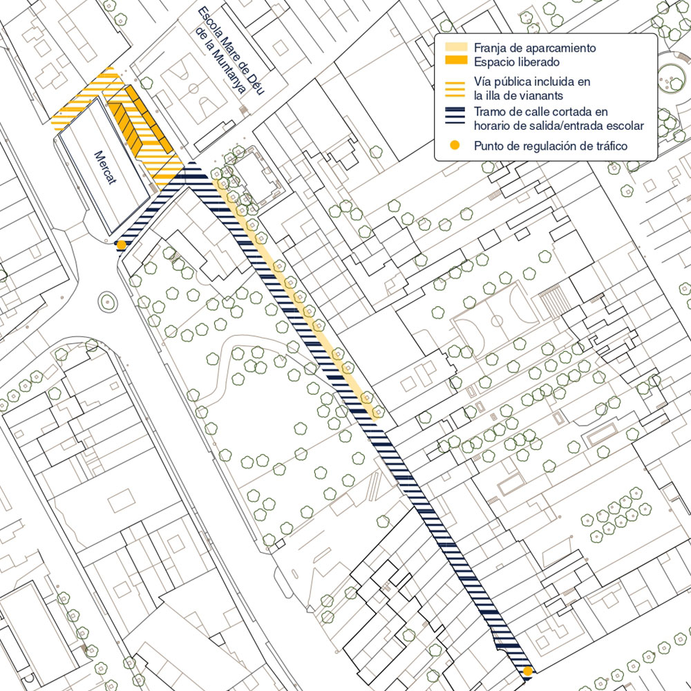 Se propone una intervención de mejora para una salida segura de la escuela Mare de Deu de la Muntanya y un calendario descentralizado de eventos. Estas propuestas incluyen medidas inmateriales que se podrían implementar fácilmente en el corto plazo, incluyendo la descentralización de eventos existentes, o el corte temporal de calles durante la salida y llegada a la escuela.