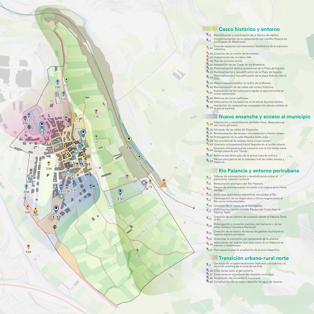 Los retos se desarrollan en el Plan de Implementación, que constituye el núcleo operativo de la estrategia. Este plan recoge un total de 62 actuaciones priorizadas y validadas mediante procesos participativos, organizadas en torno a los retos estratégicos y alineadas con los objetivos de la Agenda Urbana. Las acciones incluyen intervenciones sobre el espacio público, la rehabilitación de edificios, la regeneración ambiental o la dinamización socioeconómica, y se caracterizan mediante fichas que detallan su tipología, presupuesto, plazo, agentes implicados, relación con los ODS y sistemas de indicadores para su seguimiento. Entre ellas, destacan 11 fichas específicas de actuaciones sobre el entorno construido, desarrolladas en el marco del Plan Conviure, que concretan proyectos prioritarios con mayor nivel de definición técnica y capacidad transformadora sobre el municipio.