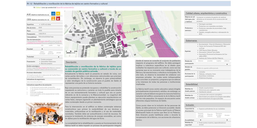 Geldo, pequeña localidad castellonense situada en el valle del Palancia entre la Serra de la Calderona y la Serra d’Espadà, apuesta por la planificación integral y participativa como vía para afrontar los retos del municipio y avanzar hacia los Objetivos de Desarrollo Sostenible. En este contexto, y en el marco de la convocatoria del Plan Conviure, se plantea la elaboración de su Estrategia Local de Rehabilitación del Entorno Construido (ELREC), una Agenda Urbana adaptada a la realidad local y con un enfoque específico en la mejora del entorno construido. Este instrumento permite al municipio definir un marco operativo alineado con la Agenda Urbana Española y los ODS, facilitando el acceso a futuras oportunidades de financiación y orientando el desarrollo urbano hacia un modelo más sostenible, inclusivo y resiliente.