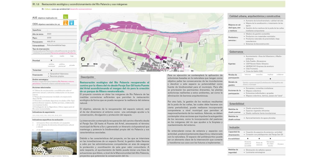 Sobre esta base se construye el marco estratégico, que define una visión de futuro para Geldo alineada con los ODS y la Agenda Urbana Española. Este marco se concreta en cuatro grandes retos estratégicos, que orientan la acción municipal hacia la regeneración del entorno construido, la mejora de la calidad urbana y ambiental, la activación del patrimonio y del espacio público, y el refuerzo de la cohesión social y la gobernanza local, junto con la identificación de ámbitos estratégicos que articulan espacialmente las actuaciones, como el casco histórico, el ensanche y accesos, el entorno del río Palancia y las áreas de transición urbano-rural.