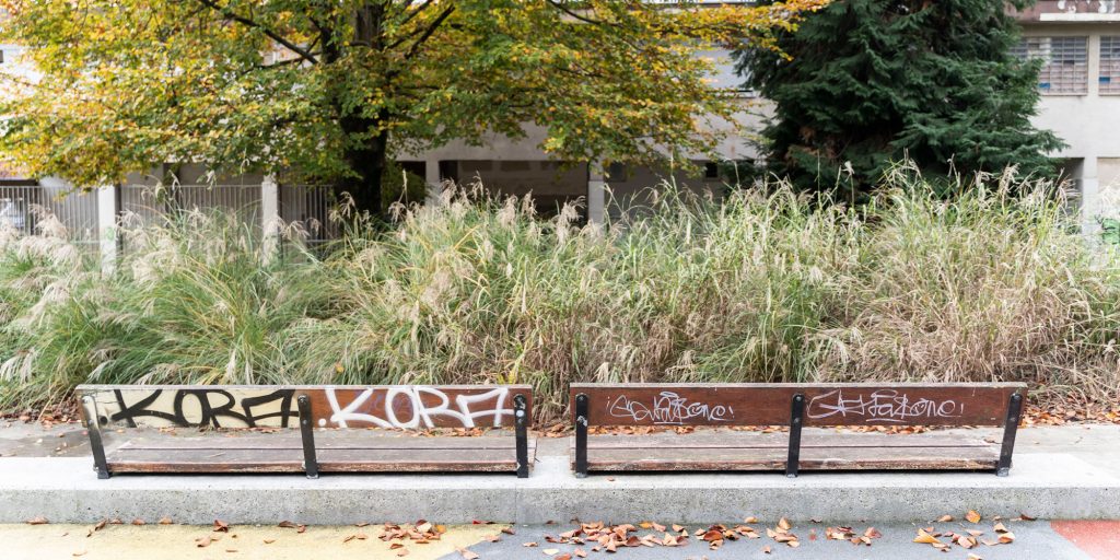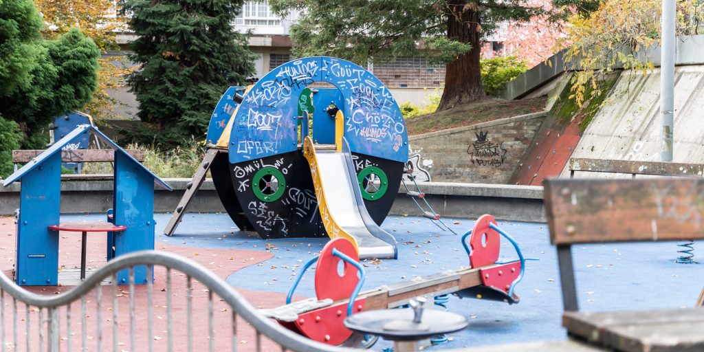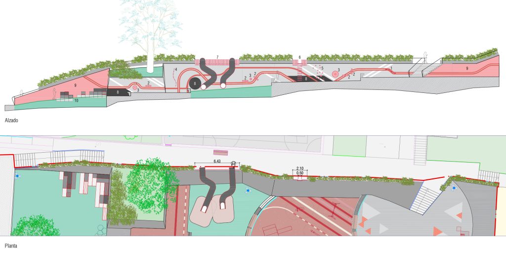 Desde estas premisas, la propuesta mantiene la ordenación original del parque, conservando la jerarquía de los recorridos principales y mejorando su accesibilidad mediante intervenciones puntuales como la adaptación de pavimentos, la apertura de pasos en muretes y la incorporación de nuevas conexiones, especialmente en sentido este-oeste. Los nuevos pavimentos, en continuidad con los existentes, combinan hormigón coloreado en tonos oscuros y grises con piezas de arcilla cocida que reproducen y reinterpretan las geometrías del parque. El mobiliario y las áreas de juego integran materiales como madera, hormigón, acero y caucho, generando espacios de estancia y actividad conectados entre sí, con especial atención al uso del color en las zonas infantiles y su relación con el muro lúdico. En conjunto, la intervención configura un parque más accesible, funcional y diverso, que refuerza su carácter paisajístico y su papel como espacio central del barrio.