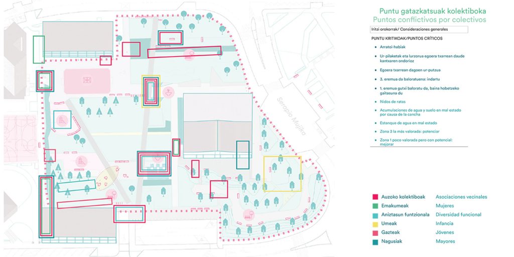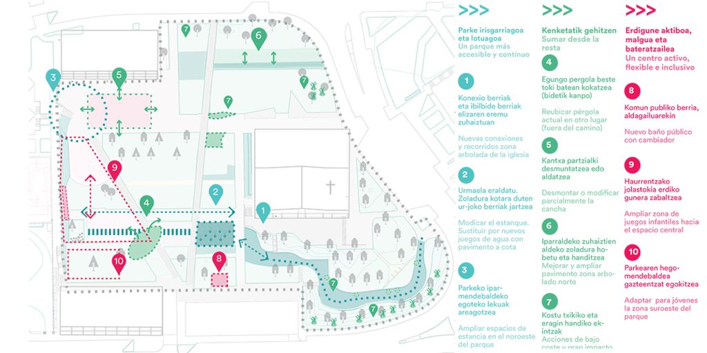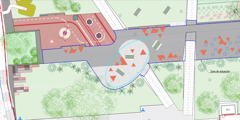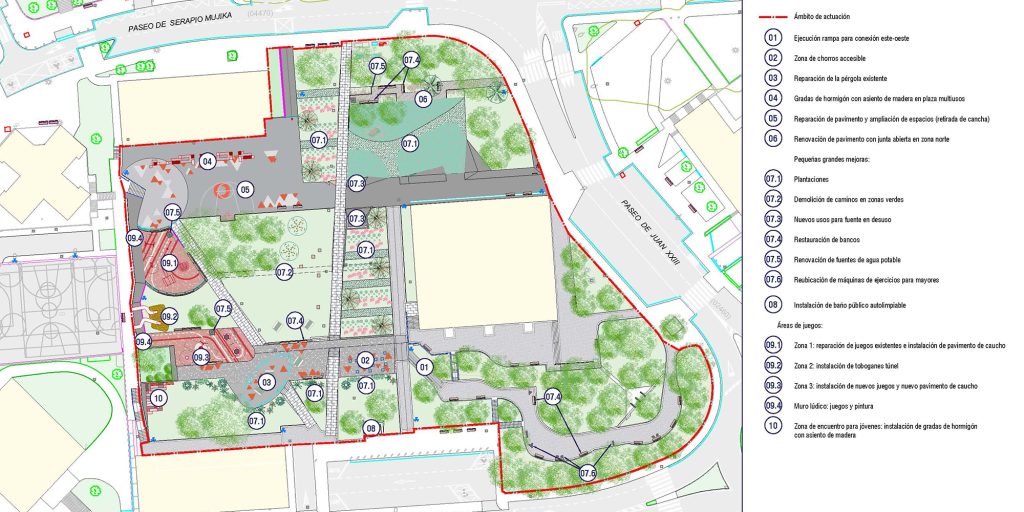 La redacción del proyecto de ejecución da continuidad a este proceso, desarrollando y concretando las soluciones de diseño a partir de un estudio de viabilidad técnica y económica y su posterior contraste con la ciudadanía. El proyecto final integra el conjunto de las actuaciones previstas, entre las que destacan la mejora de las conexiones y recorridos, la transformación del estanque en un espacio de juegos de agua accesible, la reorganización de la plaza mediante la modificación de la cancha, la ampliación de las áreas de juego y estancia, la incorporación de nuevos usos en la arboleda, la mejora del pavimento y la vegetación, así como la creación de nuevos espacios para jóvenes y un equipamiento de baño público.