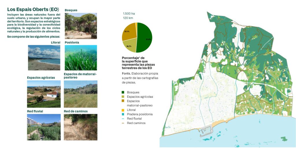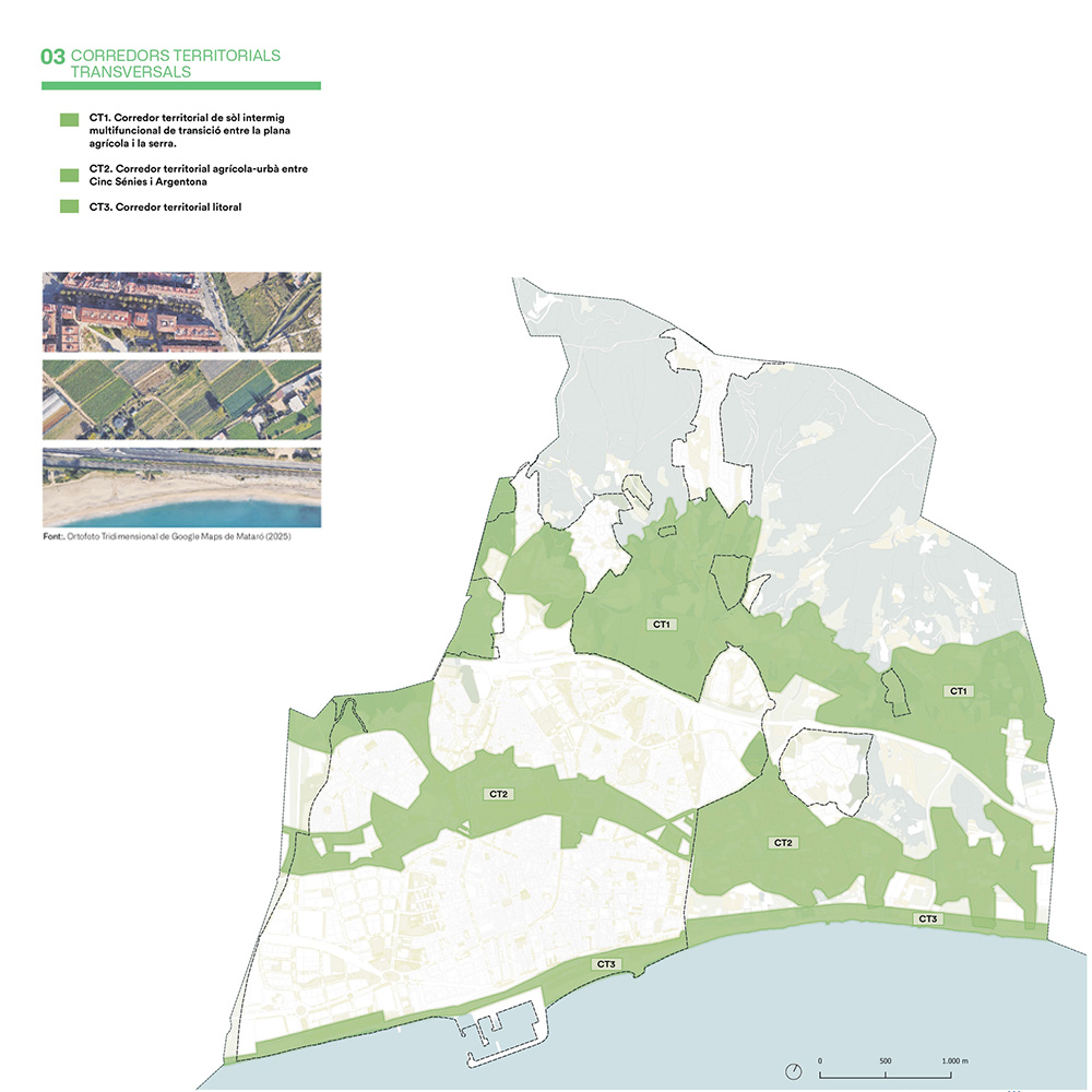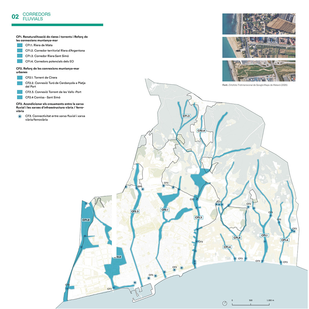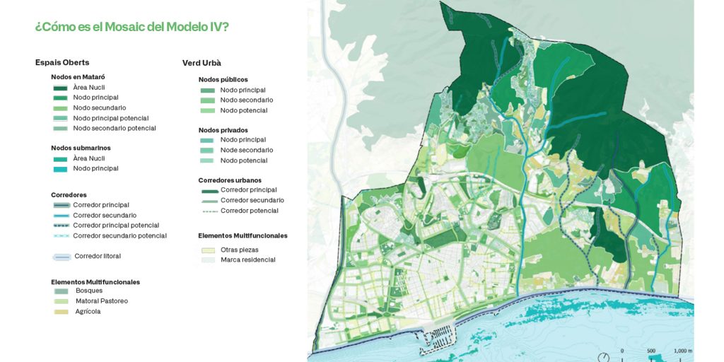 A partir de este punto, el Plan define una visión estratégica que se concreta en un modelo territorial integrado de infraestructura verde, concebido como una estructura multiescalar que articula la conectividad ecológica y la mejora de la biodiversidad, reconociendo el papel de Mataró como nexo funcional dentro de la biorregión del Maresme. Este modelo se organiza en torno a cinco elementos clave que reconocen la geografía natural del territorio: los nodos ecológicos, como espacios esenciales para la biodiversidad; los corredores fluviales que conectan el sistema montaña-mar; los corredores territoriales transversales que garantizan la continuidad de los hábitats; las áreas de amortiguación que reducen el impacto de las infraestructuras; y la red verde urbana, que conecta el tejido urbano con los espacios abiertos e integra la naturaleza en la ciudad favoreciendo los servicios ecosistémicos culturales.