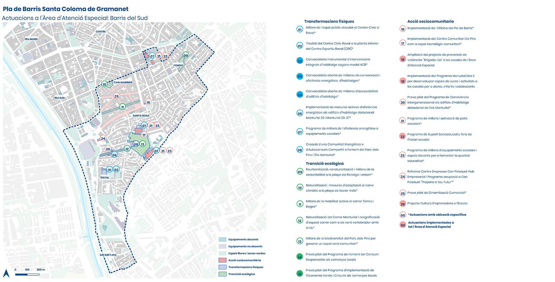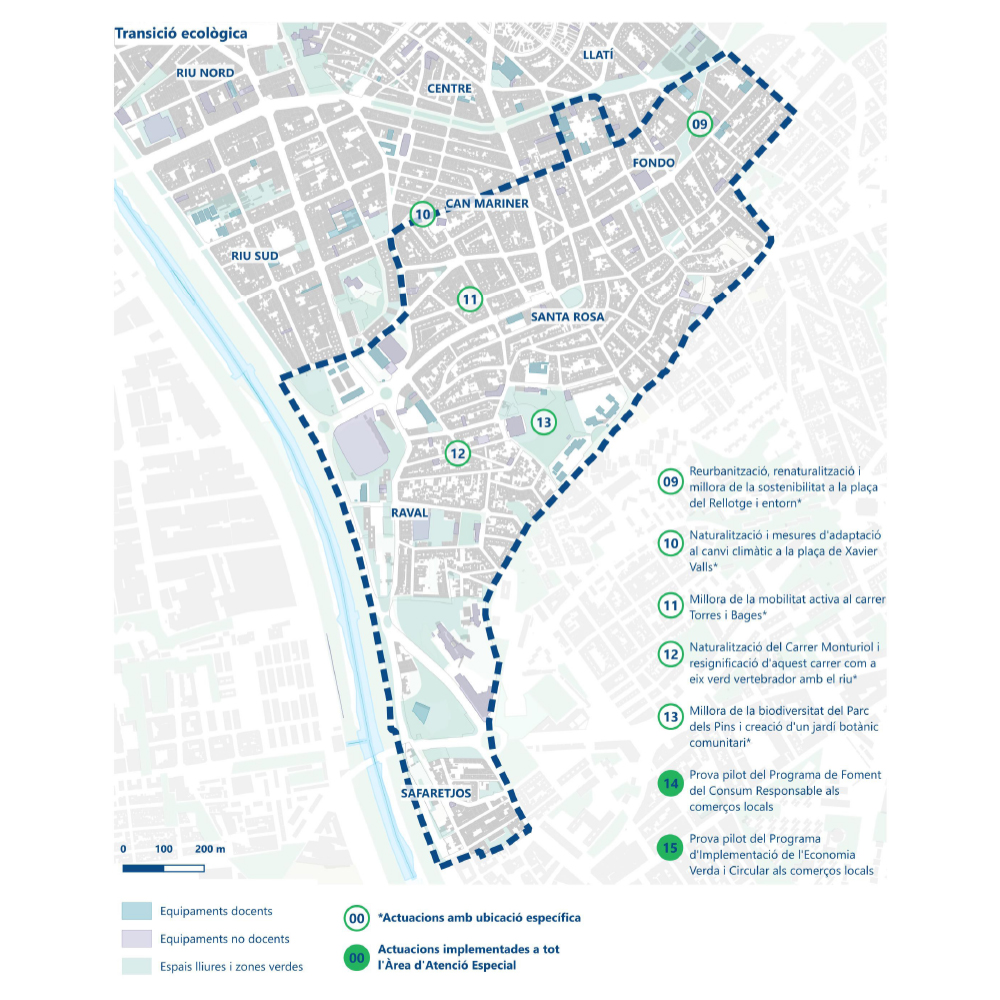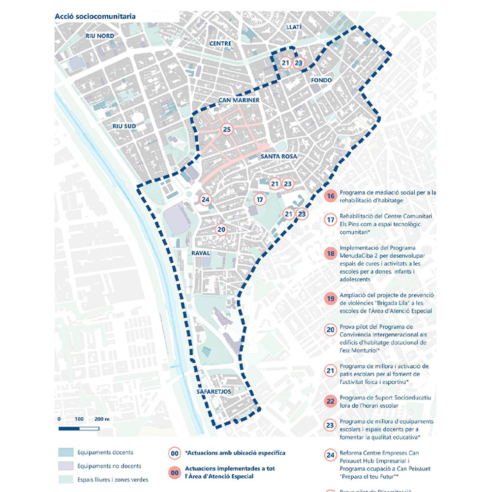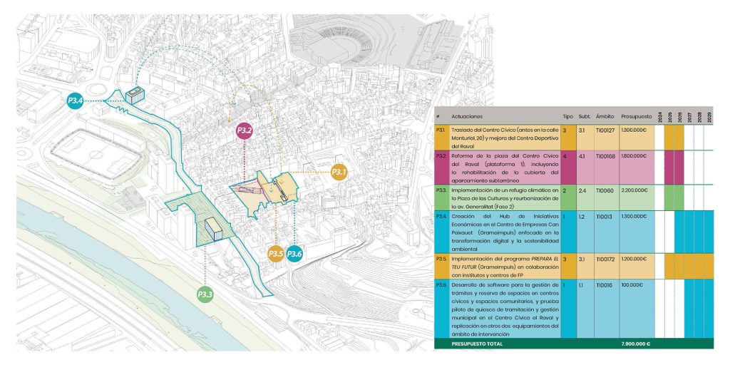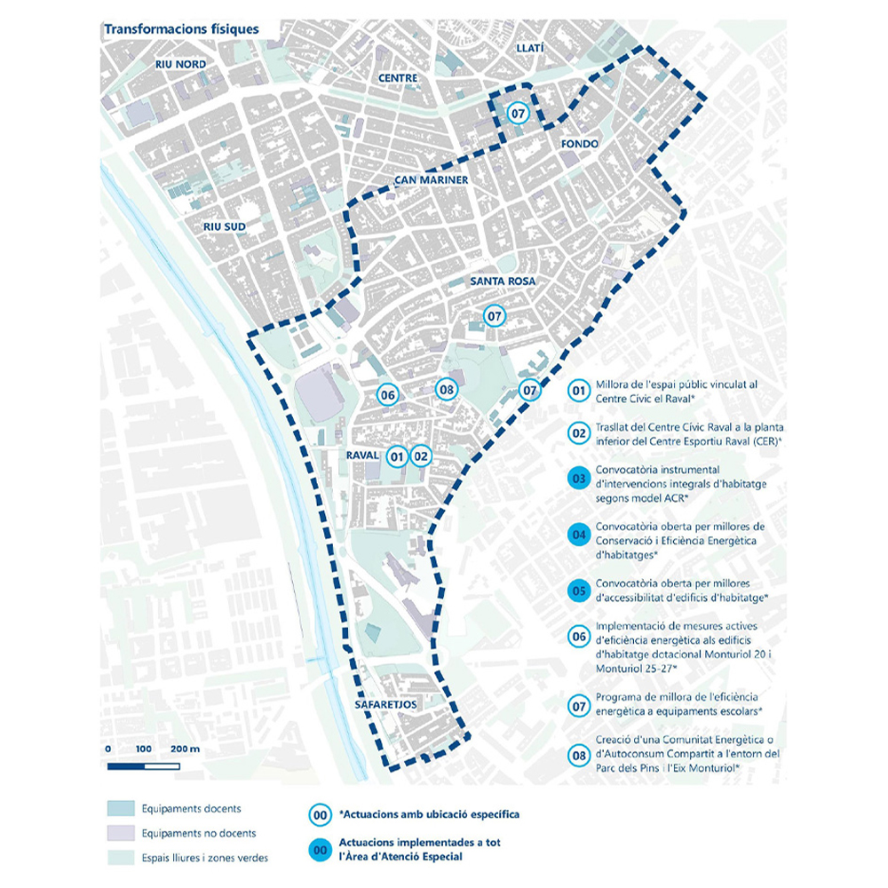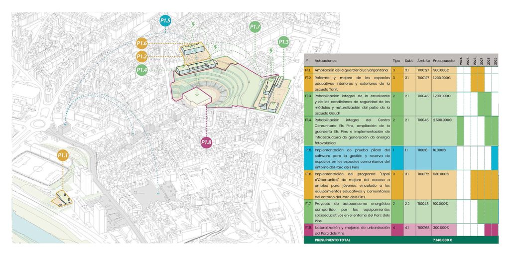 La intervención se estructura en torno a tres proyectos principales. El primero se articula alrededor del Parc dels Pins y apuesta por el desarrollo de una comunidad educadora, la mejora y rehabilitación de equipamientos educativos y comunitarios y la puesta en marcha de una comunidad piloto de autoconsumo energético compartido. El segundo aborda la transformación de la calle Monturiol como eje verde, conectando el río Besòs con el Parc dels Pins, e incluye la promoción de vivienda social destinada a una mezcla de población joven y mayor, el impulso de programas intergeneracionales y una reurbanización basada en criterios de sostenibilidad. El tercero convierte el Centro de Empresas Can Peixauet en un polo de innovación y emprendimiento, mediante la mejora de sus instalaciones y la implementación de programas de emprendimiento tecnológico, complementados con la creación de un refugio climático y el traslado del centro cívico del Raval y la mejora del centro deportivo y el espacio público adyacente.