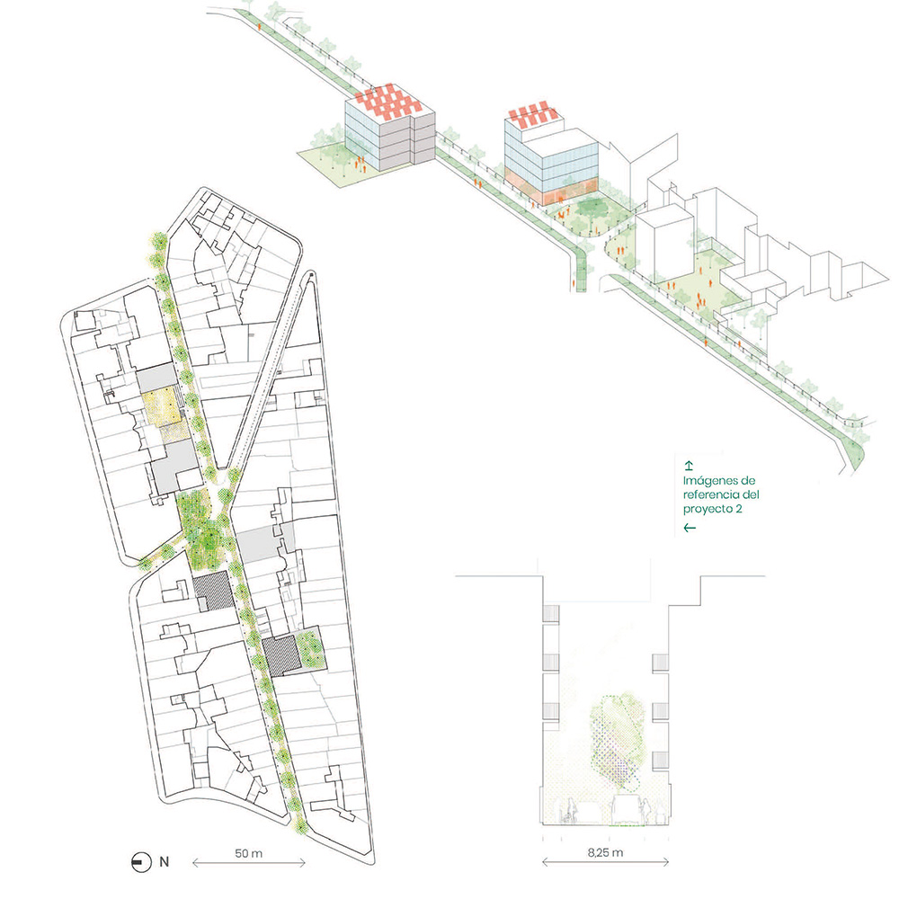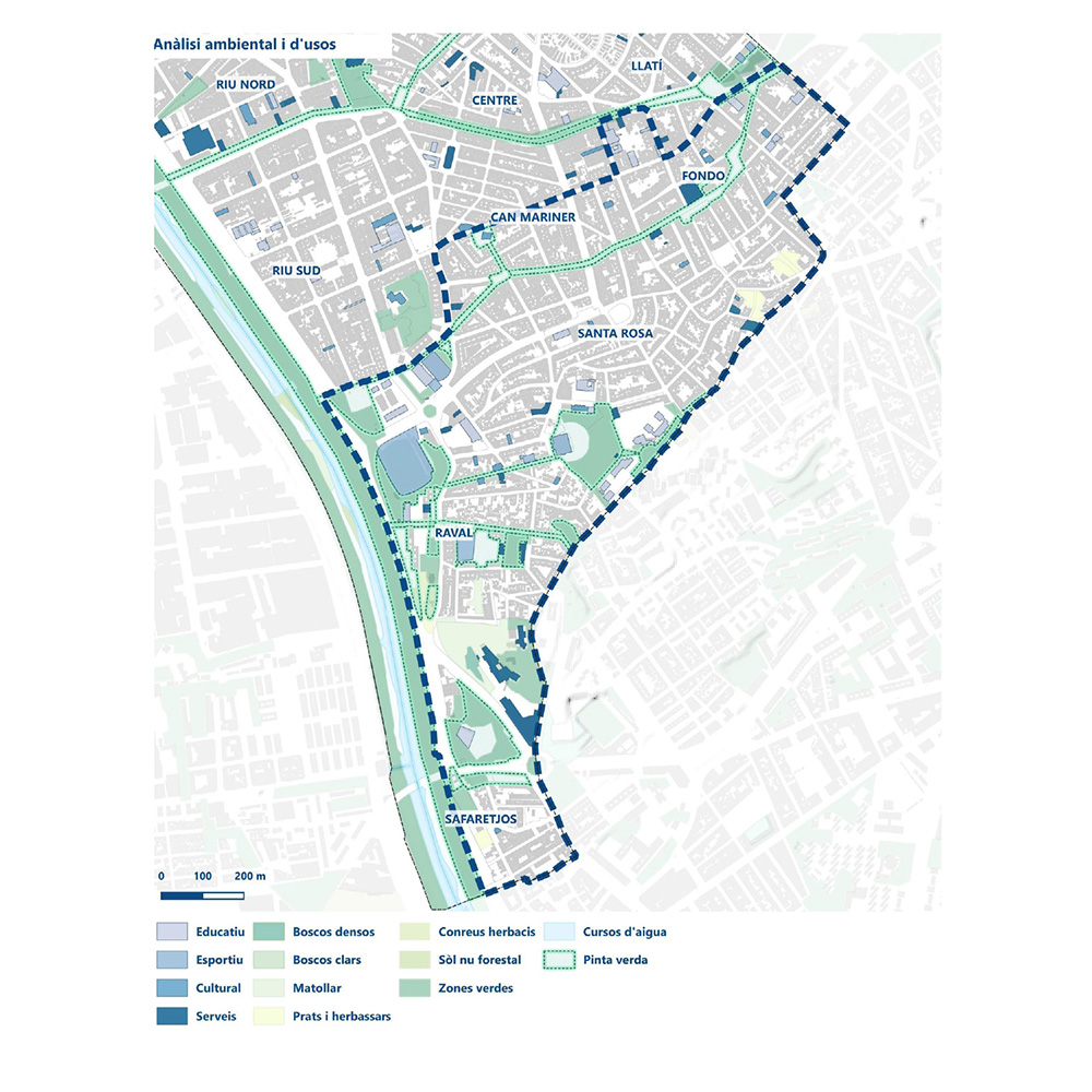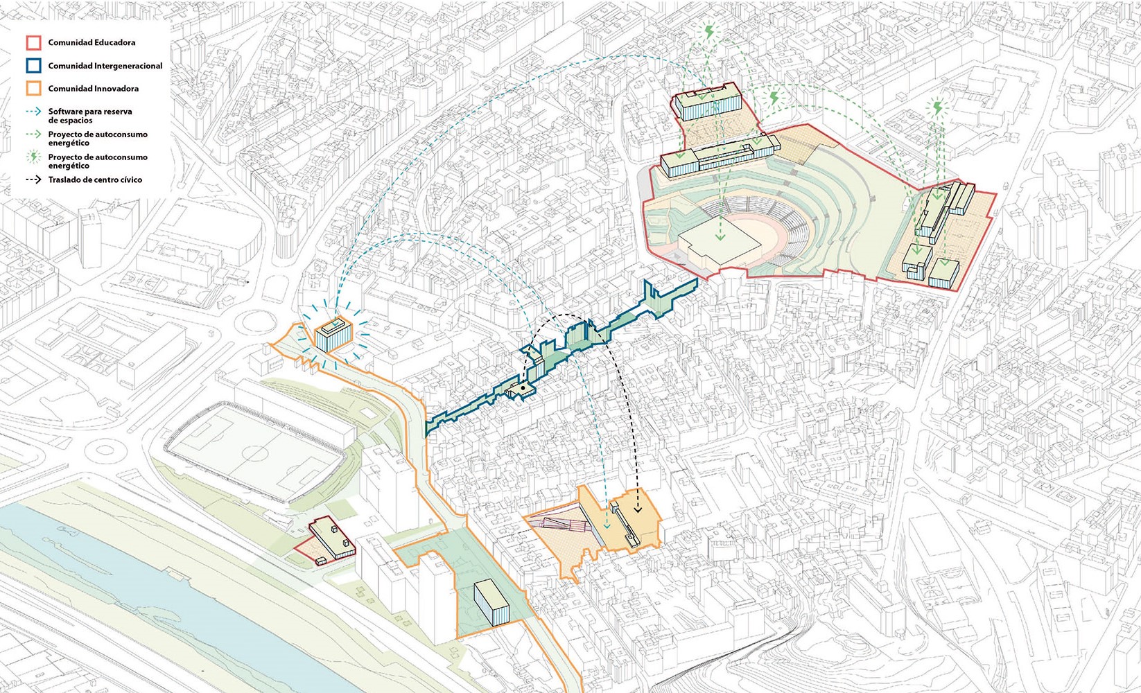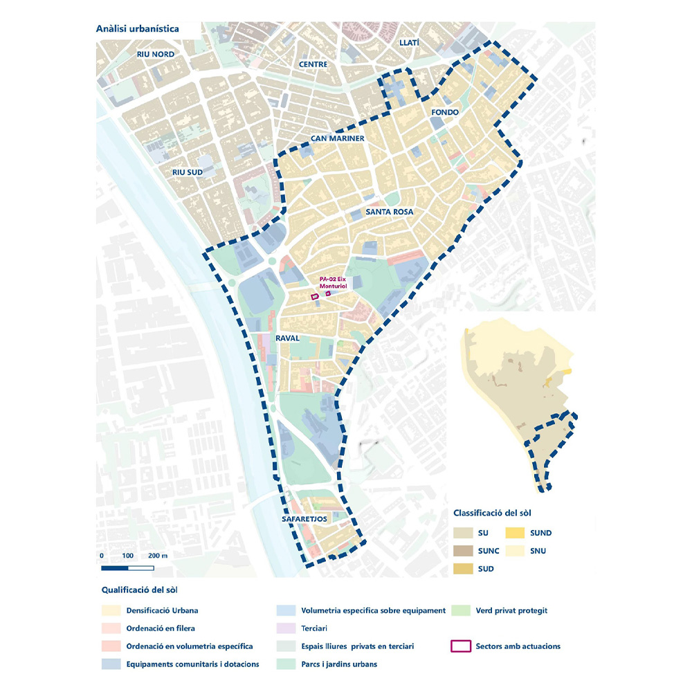 La intervención se estructura en torno a tres proyectos principales. El primero se articula alrededor del Parc dels Pins y apuesta por el desarrollo de una comunidad educadora, la mejora y rehabilitación de equipamientos educativos y comunitarios y la puesta en marcha de una comunidad piloto de autoconsumo energético compartido. El segundo aborda la transformación de la calle Monturiol como eje verde, conectando el río Besòs con el Parc dels Pins, e incluye la promoción de vivienda social destinada a una mezcla de población joven y mayor, el impulso de programas intergeneracionales y una reurbanización basada en criterios de sostenibilidad. El tercero convierte el Centro de Empresas Can Peixauet en un polo de innovación y emprendimiento, mediante la mejora de sus instalaciones y la implementación de programas de emprendimiento tecnológico, complementados con la creación de un refugio climático y el traslado del centro cívico del Raval y la mejora del centro deportivo y el espacio público adyacente.