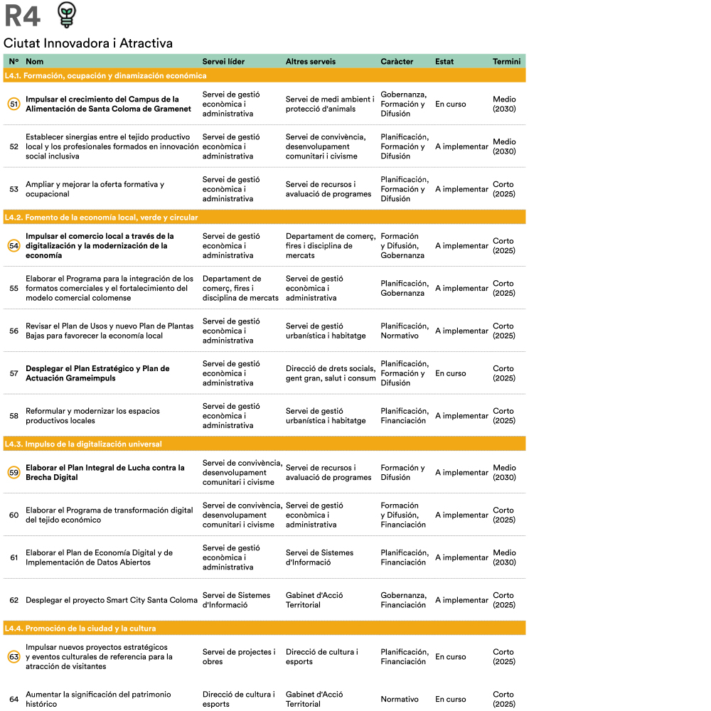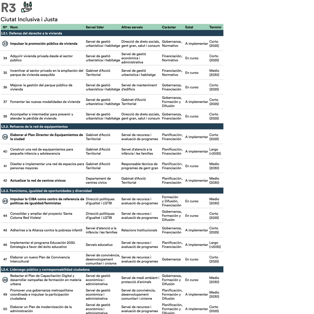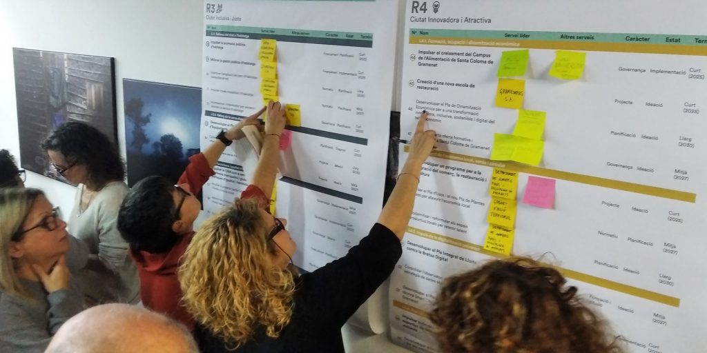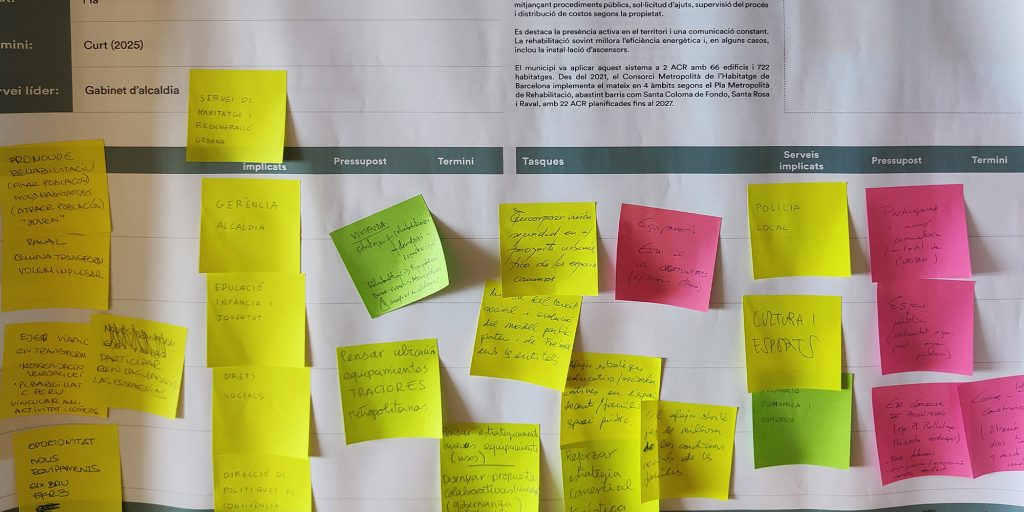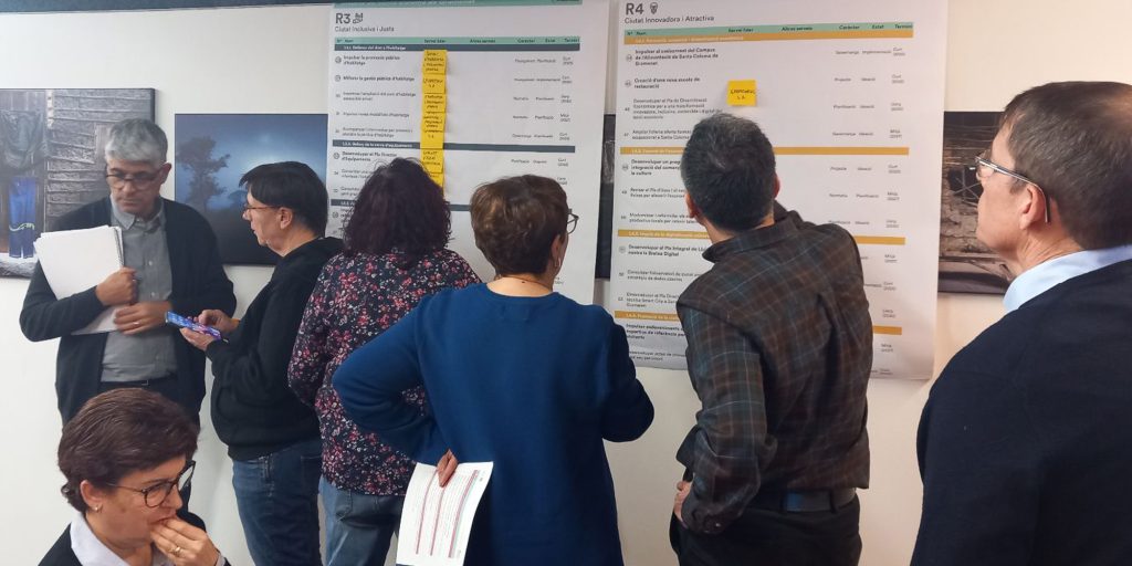 A partir de tres sesiones transversales de trabajo con técnicas y técnicos municipales de diferentes servicios y direcciones del Ayuntamiento se realiza una revisión general del plan de acción, una priorización de las acciones tractoras y un desarrollo en profundidad de estas últimas. Manteniendo la estructura original de cuatro retos estratégicos, se reestructura el plan de acción y se identifican 55 actuaciones, de las cuales 14 son acciones tractoras y se desarrollan en fichas específicas.
