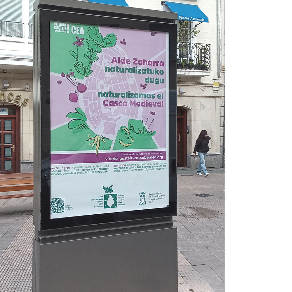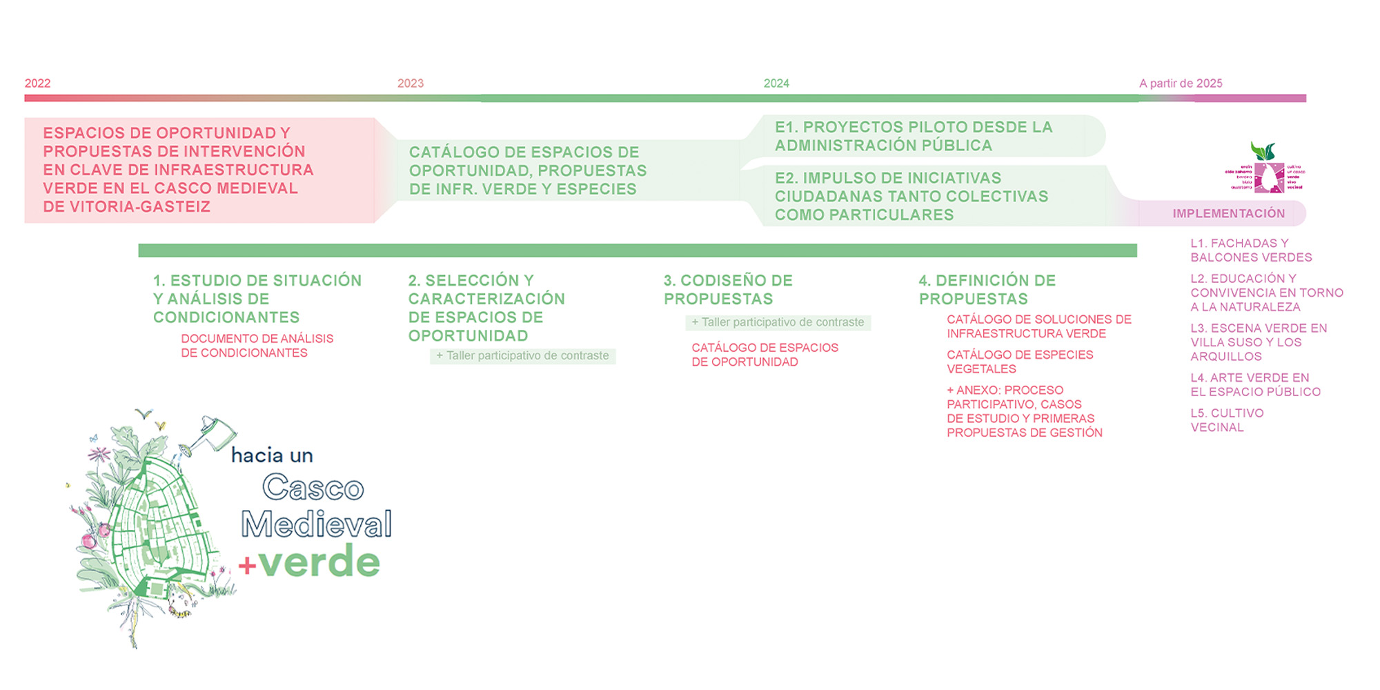 El Ayuntamiento de Vitoria-Gasteiz, comprometido con la naturalización urbana, ha desarrollado durante la última década numerosas intervenciones orientadas a incrementar la biodiversidad y los servicios ecosistémicos, principalmente en parques, jardines y espacios periurbanos, a partir de la Estrategia de Infraestructura Verde Urbana aprobada por la ciudad en 2014. Sin embargo, su centro histórico, el Casco Medieval —uno de los ámbitos más emblemáticos de la ciudad— presenta un déficit significativo de zonas verdes, con menos de 5 m² por habitante frente a los 14-20 m² del resto del municipio. Esta situación pone de manifiesto la necesidad de incorporar soluciones de infraestructura verde adaptadas a este entorno urbano, con condicionantes propios derivados de su historia, su morfología, su actividad actual y los procesos de regeneración y reurbanización desarrollados en el mismo.
