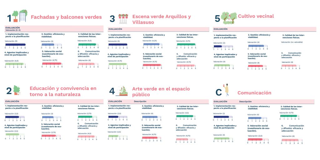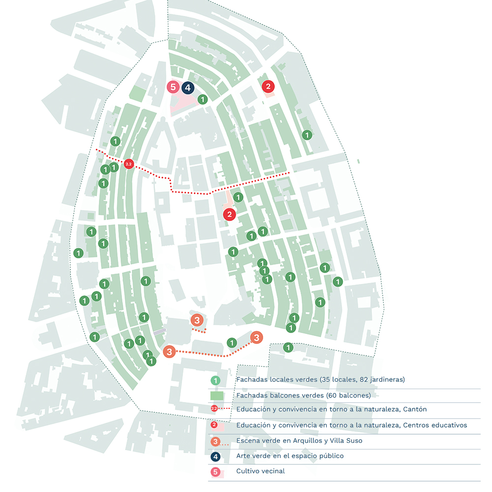El programa de acciones resultante se articula en cinco líneas de actuación, complementadas por una estrategia transversal de comunicación y sensibilización. Estas líneas incluyen la implementación de fachadas y balcones verdes, el desarrollo de acciones educativas y de convivencia en torno a la naturaleza, la creación de escenas verdes en espacios emblemáticos como los Arquillos y Villa Suso, la incorporación de intervenciones de arte y vegetación en el espacio público y el impulso de iniciativas de cultivo vecinal.
