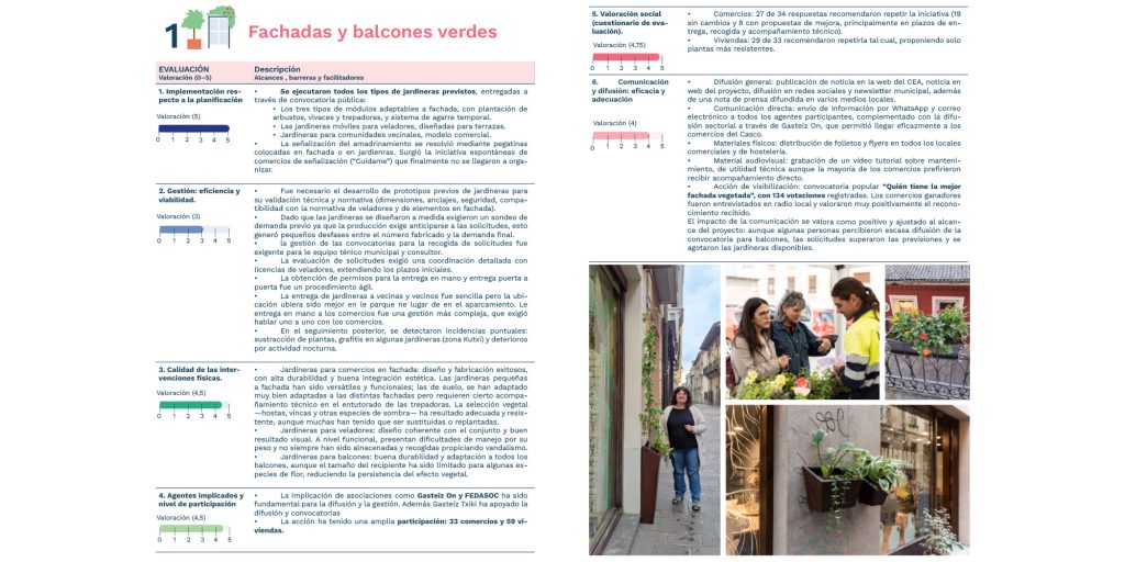 Como resultado de esta evaluación, se identifican dos líneas de actuación con especial potencial de continuidad y escalado. Por un lado, la línea de fachadas y balcones verdes, que ha permitido la instalación, mediante convocatoria pública, de distintos tipos de jardineras —módulos adaptados a fachada, jardineras móviles para veladores y modelos para comunidades—, promoviendo la incorporación de vegetación en viviendas y comercios y contribuyendo a generar un paisaje urbano más vivo. Por otro, la escena verde en los Arquillos y Villa Suso, basada en la instalación de jardineras en estos espacios emblemáticos, integradas en su mantenimiento y acompañadas de un modelo de custodia vecinal en los Arquillos, consolidando una intervención de alta visibilidad que refuerza la imagen verde del Casco y sensibiliza sobre su cuidado.