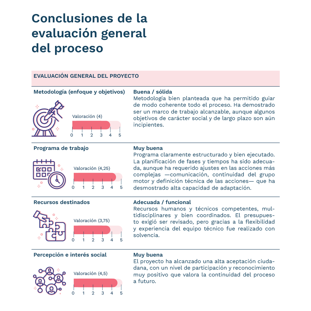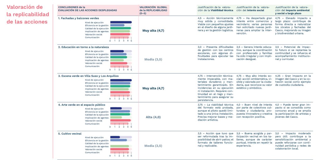 La implementación del programa ha permitido testar soluciones de naturalización a pequeña escala en espacios públicos y privados, así como generar aprendizajes sobre su viabilidad técnica, su aceptación social y su mantenimiento en el tiempo. El proyecto se completa con una evaluación final orientada a analizar el grado de replicabilidad de las acciones, identificar mejoras y establecer recomendaciones para su continuidad o integración en futuros programas municipales.